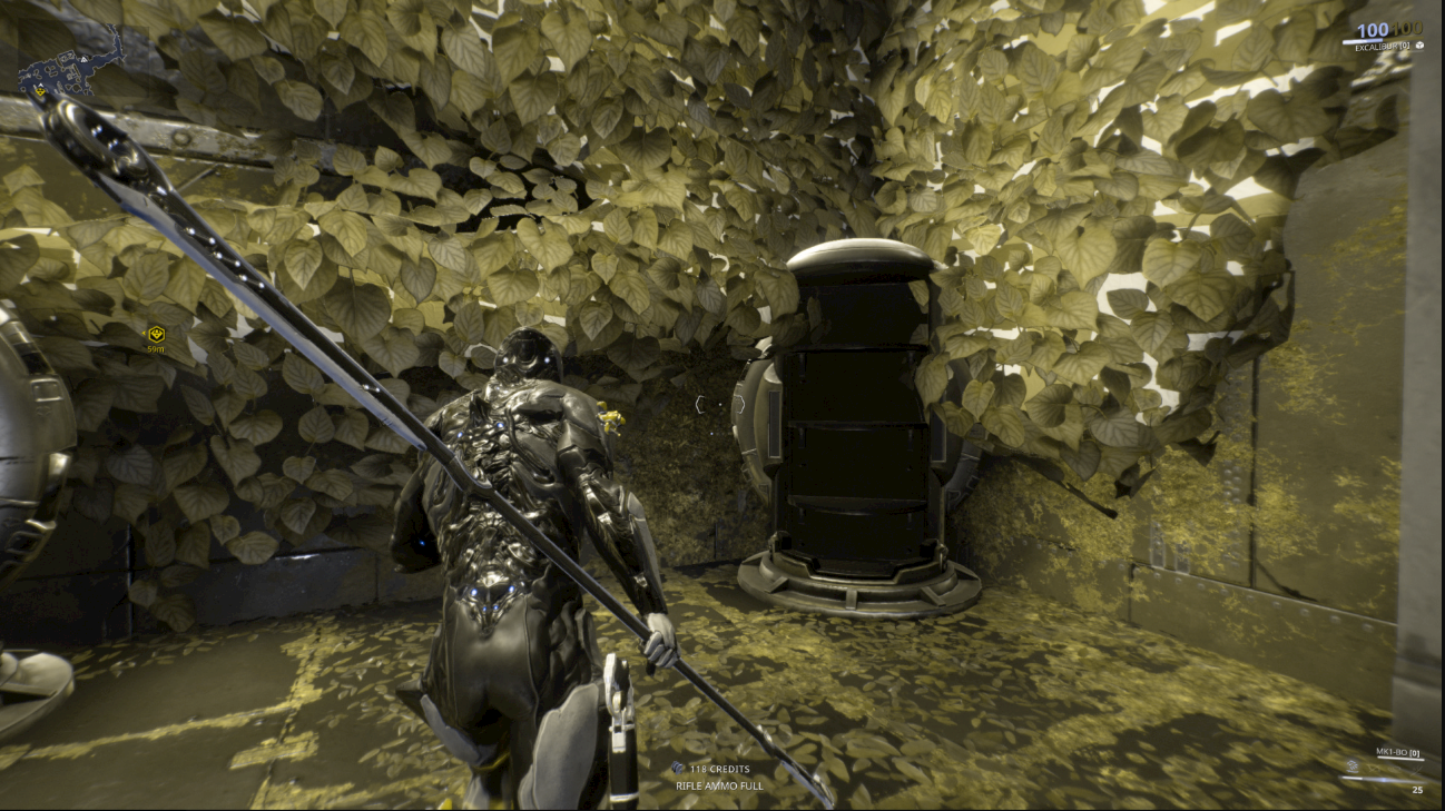 Warframe has a very unobtrusive display for the current characters abilities. A horizontal progress bar displays the users current energy, with the actual number displayed below. Above the bar is the 4 Warframe-specific abilities, represented with iconography. This system relies on colouring these icons based on the abilities status: