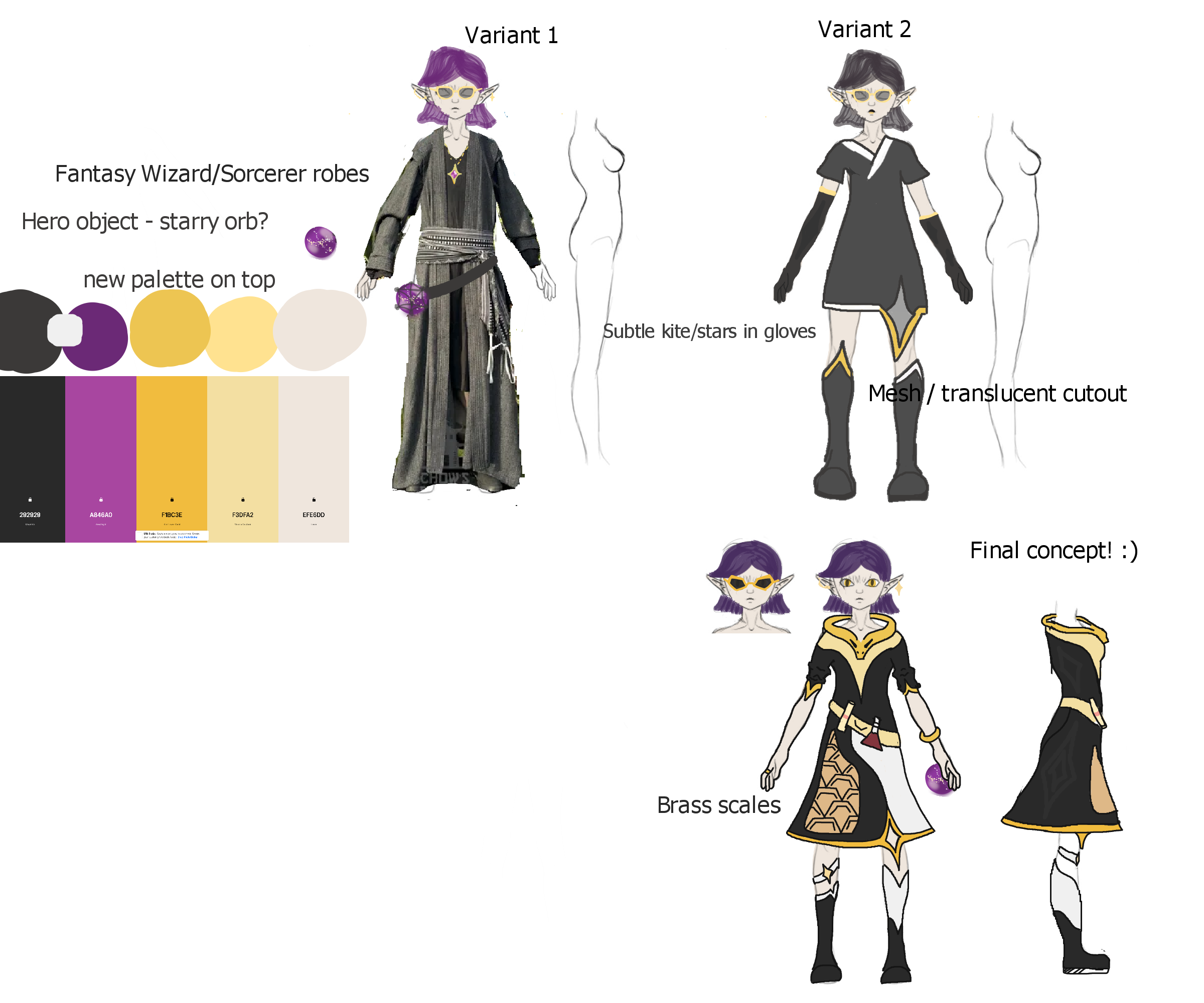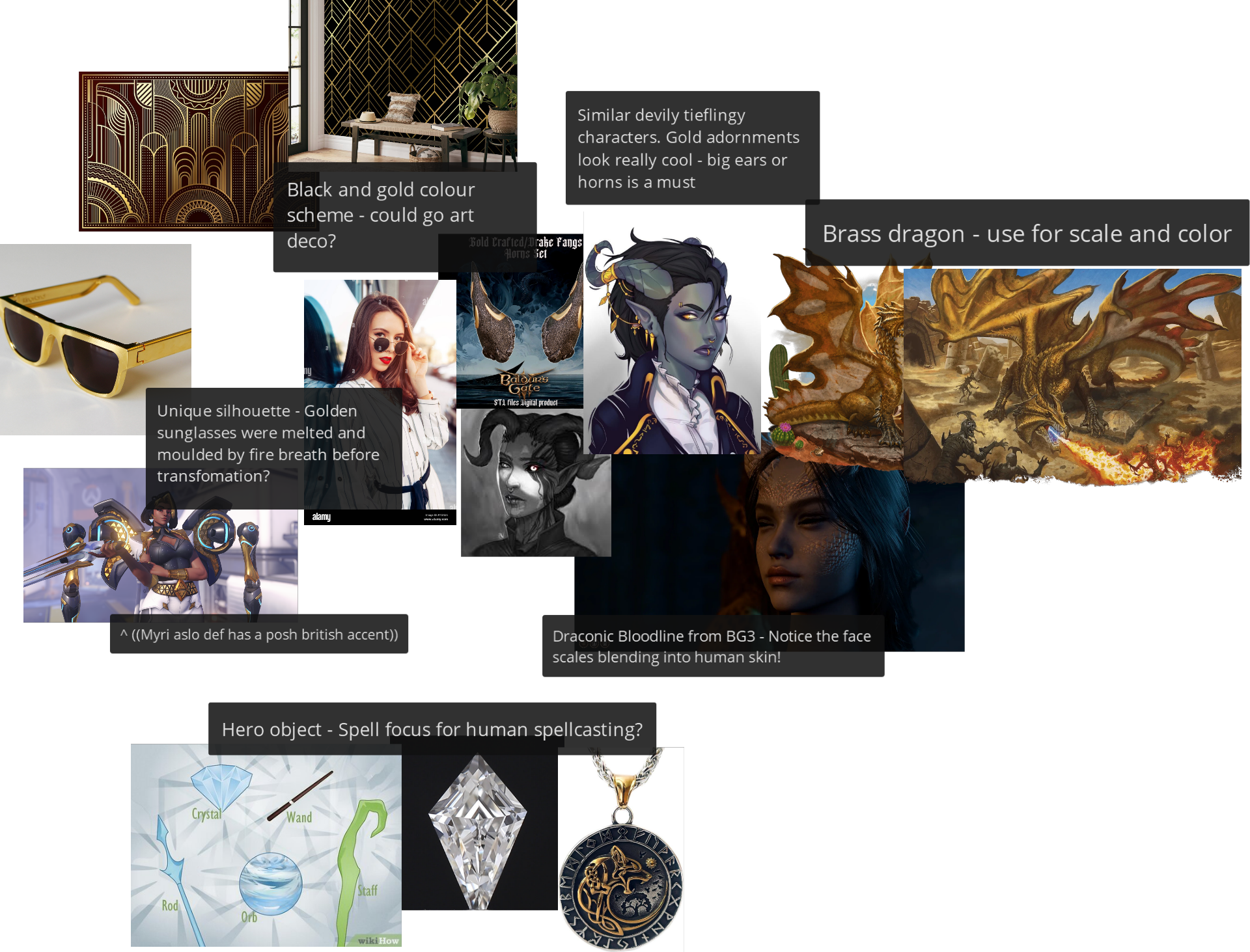 I then created a moodboard to help explore themes and character story I wanted them to represent - they are a brass dragon, they wear gold from their old hoard, they have a spellcasting object as they cannot cast magic without it.