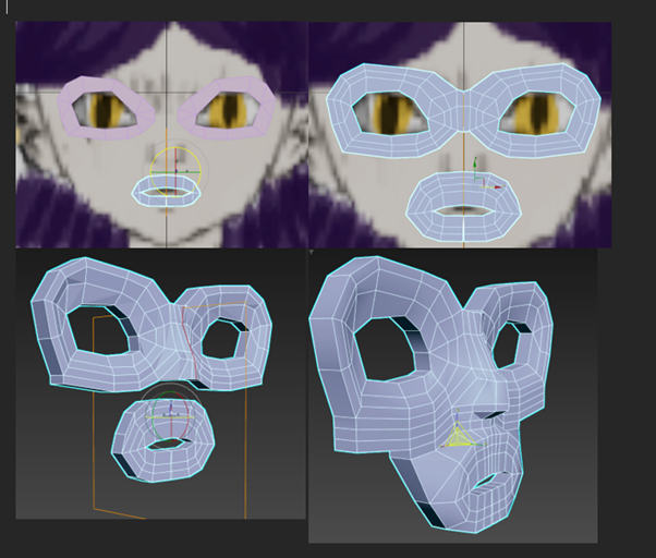 I took a flat approach to starting the face, where i would focus on good topology first before attaching it to the head. This made the face look very uncanny and poorly propotioned at first, but with smoothing and readjusting the width of many of the edges it came out a lot smoother and developed a more anime style.
