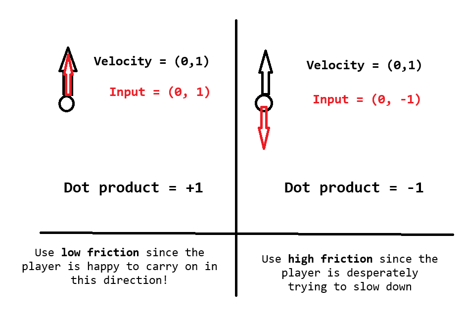 I vaugely remembered hearing about dot products in my sixth-form maths, often used as a way to get the angle between two vectors. I realised that this could be used to get the difference between the direction of the players velocity vs the direction they want to go.
